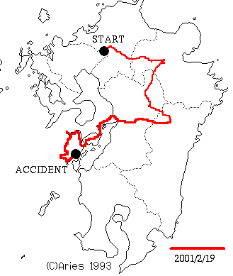 ◎河浦町県道35でアクシデント 夕暮れを天草町の海で味わいたかったので、下島の内部を走って再び先程のR389に出ることにする。 Rから河浦町35に左折し、緩やかなカーブをひとつふたつこえるところだった、 右カーブの対行車線に一台のバスが止まっており、乗客が乗り降りしていた。 そのバスとすれちがうところで、バスの蔭からトラックがヌッとその面をあらわにした。 急制動するが、あえなく衝突。意識を失い、気がつくと救急車がやってきた。 志なかばにして、今回のツーリングは終了。入院は一日で済み、重大な怪我がなかったのが幸いだった。 (痛みは1ヵ月以上続いたが) トラックは、バスをパスしてこちらの車線側にある資材置場のような場所に進入したかったようだ。 GSF750は修理見積もり100万円オーバーで、全損扱いになってしまった。 双方が走行中だったが、過失割合はごねることなく100:0(トラック:GSF)となった。 |