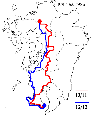 概要12月11〜12日(一泊二日) ●日時 2000年12月11日 天候 雨あがり後晴れ 基山発〜R3〜鳥栖〜県14〜R210〜田主丸町〜鷹取山行きどまり〜県151〜浮羽町〜 県52〜耳納峠〜星野村〜県57〜R442〜中津江村〜県9〜穴川峠〜県133〜 R325〜熊本空港〜R443〜御船町〜R445〜矢部町通潤橋〜R218〜中央町〜R443〜 東陽村〜県25〜大通越〜五木村〜R445〜人吉市〜R267〜矢岳高原〜県408〜 えびの市〜R268〜県103〜野々湯〜R223〜牧園町〜隼人町〜R10〜鹿児島市〜 県22〜吹上町〜R270〜加世田市〜県269〜坊津町〜R226〜枕崎市〜山川町〜くりや旅館泊 ◎走行距離→524km ◎食事→起床後、飲まず食わずで指宿着。くりや旅館で鰹たたき定食+ブリ刺身+生ビール+アイスクリーム(2000円ちょっと) ●日時 2000年12月12日 天候 晴 くりや旅館発〜R226〜入野〜開聞岳を半時計回り〜長崎鼻〜R226〜枕崎市〜坊津町〜 R226〜今藤峠〜R226〜野間池〜R226〜笠沙町〜加世田市〜県20〜R270〜市来町〜 R3〜串木野市〜阿久根市〜R389〜黒之瀬戸大橋〜荒崎黒之浜港線〜出水市〜鶴の飛来地〜 R3〜水俣市〜県56〜大崎鼻公園〜湯の児〜R3〜八代市〜熊本市〜山鹿市〜八女市〜 久留米市(丸星ラーメン食す)〜基山町の自宅着 ◎走行距離→450km ◎食事→旅館朝食、久留米ラーメン(350+100yen) ●まとめ ◎一泊二日 ◎出費→ガソリン代約6000円、食費(2500yen)、宿代(朝食付1920yen) ◎食事→上記参照 ◎総走行距離→974km 鹿児島県揖宿に、日本一安い旅館「くりや旅館」があるというので、 これを目的地に設定した。 防寒対策として、ジーンズの下にこれまでのジャージにかわり、 毛っぽいモモヒキのようなものをよかれと思い新調したがこれが失敗でライディングが非常に窮屈だった。 初日は午前中ウェットだったこともあって、窮屈さの下で思うように運転できず、 楽しさには恵まれなかった。路面が乾いてからも熊本通潤橋あたりまではクルマの流れが非常に悪く、 ペースがいっこうに上がらない。鹿児島県坊津町の夕暮れはよかった。 くりや旅館は、いたれりつくせりを求める人には勧められないが、 うまい飯と布団があればそれでいい、という割り切った人にはおすすめできる。 夜の静かな海の波の音はとても心地よく耳に、心に響いてきた。 2日目は壮快さを求めて海沿い中心。残念ながら、楽しめるワインディングには出会えずじまい。 交通量が多い。 今回のツーリングで得た教訓は、バイクツーリングでは熊本市近辺は通らないということ。 九州を南下したい場合は、普段通り、基山〜日田〜やまなみあたり経由するとよい。 たとえ天草に行く場合でも、遠回りすべきだ。この教訓を生かし、次なるツーリングルートを計画中である。 今回は僕にしては贅沢な金の使い方をした。宿と、食事と。高級旅館に比べれば微々たるものだが、 満足度は高かった。あんな豊かな気持になれたのは久々だ。民宿1泊程度なら5000円以下でプラニングできるだろうから、 今後は民宿泊ツーリングも考えたい。 1日目日記はこちら 2日目日記はこちら |